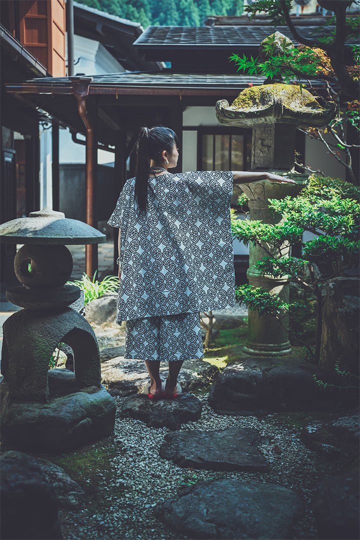 ODORIGIは、郡上のシルクスクリーン産業を活かし、プリントから仕立てまですべて地元で製作された衣服です。郡上の歴史的衣服にならった直線裁ちにより、踊ることで衣の面的な美しさを引き出しながら、踊り手の姿勢や美意識をあらわし、郡上の盆踊り文化を体現します。